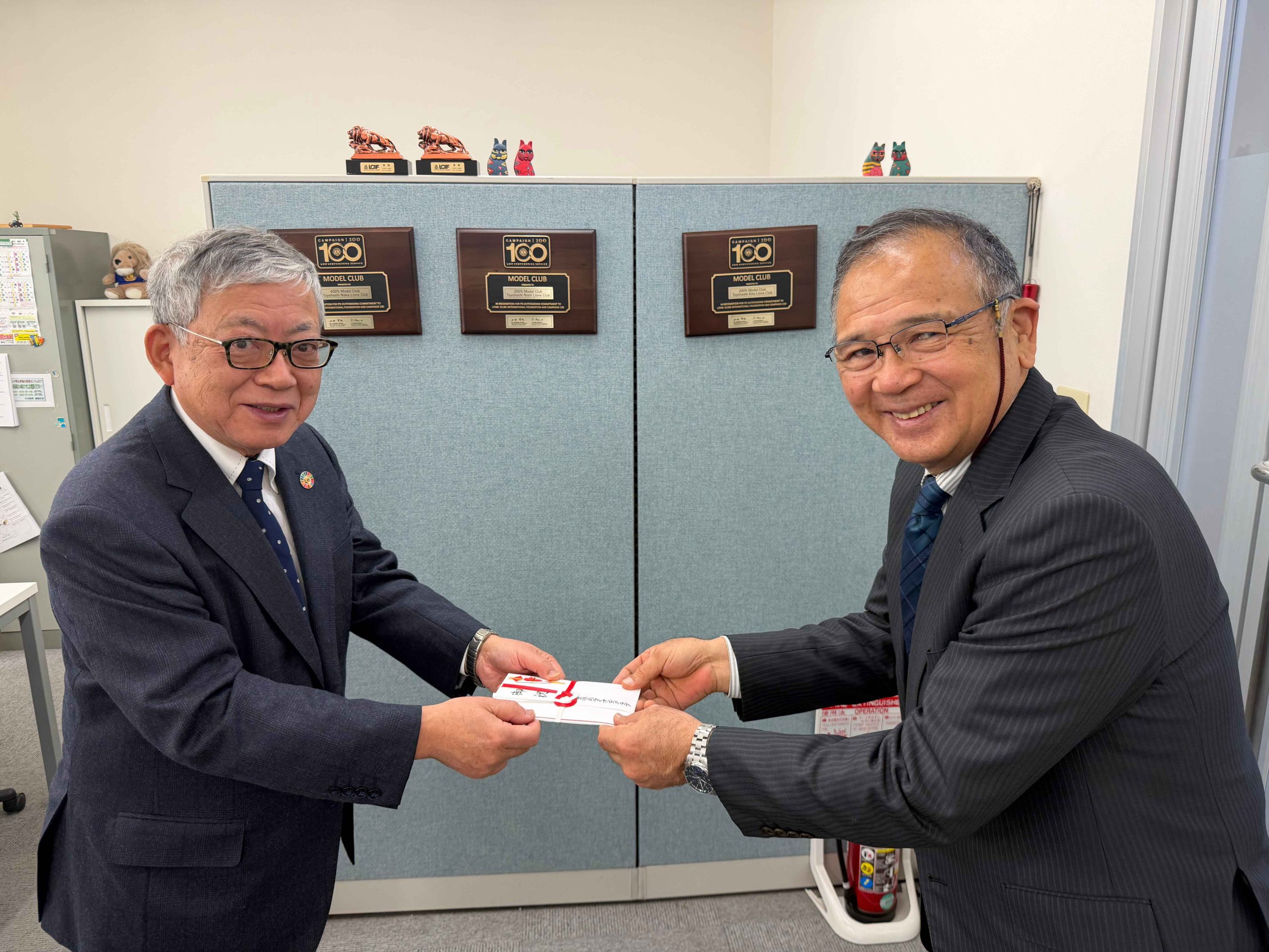 豊橋市剣道連盟目録贈呈式 投稿日時: 2026年2月13日 投稿者: admin 【日時】 令和8年1月20月(火)10:00~10:30 【場所】 合同事務局内 来る令和8年2月1日「第42回豊橋南ライオンズクラブ旗争奪豊橋市少年剣道大会」事業の目録贈呈式が本大会に先立ち、ライオンズ合同事務局内にて行われました。 豊橋南ライオンズ会長L佐原光一(写真左)より、豊橋剣道協会会長二橋隆会長(写真右)へ目録が贈呈されました。 事業委員長L高橋一仁はじめ、豊橋南ライオンズと豊橋剣道連盟で大会の事前確認が行われました。